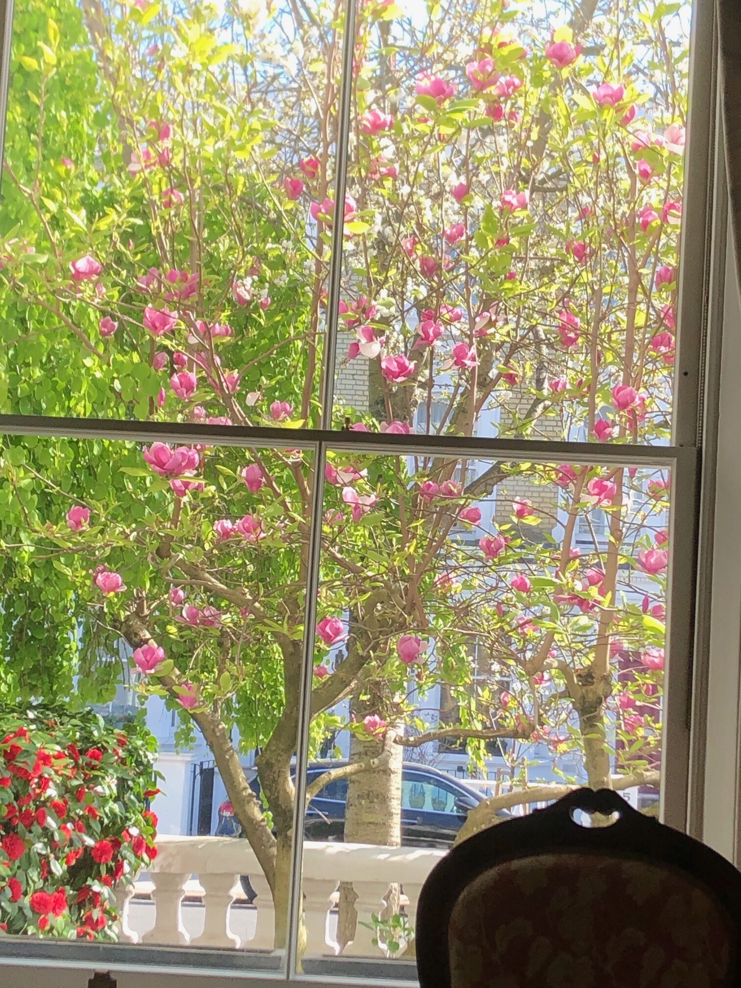 Pale purple magnolia globes are nodding in the wind outside the front window, and their petals falling far too soon on the paving in the front yard. They have banana-skin propensities; I have to keep sweeping them up. It’s strange to think that this extravagant flower was apparently an early arrival in the course of evolution. They don’t seem to be good at attracting insects; there are none in sight. Their fleshy petals, it seems, were designed – if that’s the word – as food for beetles. Flowers became more economical as nature grew up; just look at the tiny red dots on an oak.